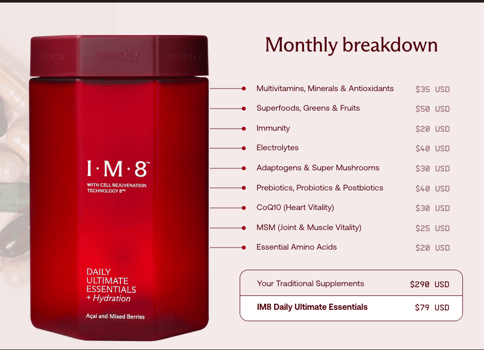 I did not expect this, but newcomer IM8 Daily Essentials + Hydration ($79) blew it out of the park and claimed the top spot on my list. Here’s why it checked all my boxes:
